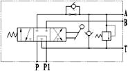 35SZH型組合閥用于備胎架液壓系統的升降控制時(shí),P口與轉向助力泵出油口連接,P1口與轉向器進(jìn)油口連接,A口接備胎架油缸小腔,B口接備胎架油缸大腔,T口接轉向系統油箱。通過(guò)操縱該閥手柄桿,控制油缸伸出或退回,實(shí)現對備胎架升降的控制。該閥的工作原理示意圖如下: