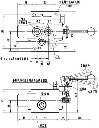 該閥在中位時(shí),P口到P1口接轉向器供汽車(chē)行駛轉向用。這時(shí)將換向閥操縱桿加以鎖緊裝置防止滑閥竄動(dòng),保證汽車(chē)安全行駛。當操作換向閥手柄在位置Ⅰ時(shí)P口到B口接油缸大腔,此時(shí)備胎機構下降,油缸小腔由A口到P1口利用轉向器中位的H型機能排油流回油箱。當操作換向閥在位置Ⅱ時(shí)P口到A口接油缸小腔,此時(shí)備胎機構舉升,油缸大腔由B口到T口排油流回油箱。