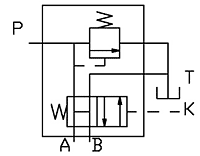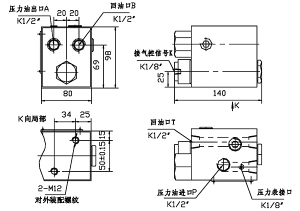 EQ340氣控分配閥是常開(kāi)式二位四通換向閥與直動(dòng)式溢流閥的復合?捎糜谝磺杏袎嚎s空氣源的工程機械、運輸機械等的液壓系統中,能可靠地控制工作油缸的舉升,有效地防止液壓系統過(guò)載,實(shí)現系統卸荷,起到安全、節能作用。有氣控信號時(shí),二位四通換向閥換向,P與T斷開(kāi)與A接通,系統在溢流閥限定壓下工作,溢流閥起安全作用。無(wú)氣控信號時(shí),換向閥在彈簧作用下復位,P、A與T接通,系統卸荷。