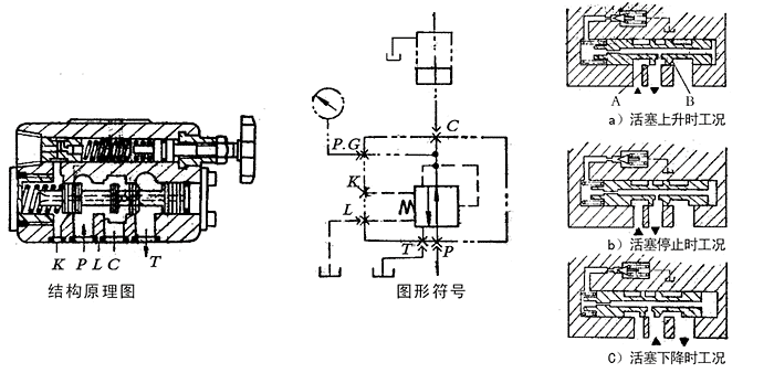 RBG-03先導式平衡閥的主閥為滑閥式結構。圖a)為缸上升的情況,當C口的壓力未達到設定的壓力時(shí),滑閥在彈簧力的作用下處于圖示位置,閥口A(yíng)開(kāi)啟,壓力油由P口至C口,活塞上升。圖b)為活塞停止時(shí)的情況,當C口壓力達到設定壓力后,導閥開(kāi)啟,滑閥上的節流孔使滑閥兩端產(chǎn)生壓差,滑閥左移減壓,直至閥口A(yíng)關(guān)閉;若泄漏使C口壓力下降,則滑閥右移,P口向C口供油,從而使C口壓力恒定,達到平衡目的.圖c)為活塞下降的情況,當缸加上外負載,C口的壓力大于設定壓力時(shí),滑閥兩端的壓差增大,滑閥左移到圖示位置,閥口B打開(kāi),油液由C口流向T口。從遙控口K接遠程調壓閥,可對C口的設定壓力進(jìn)行遠控。