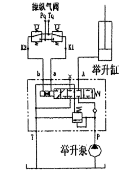 當氣控口a接通氣源,推動(dòng)氣控換向閥的閥芯至舉升位置使車(chē)廂舉升。